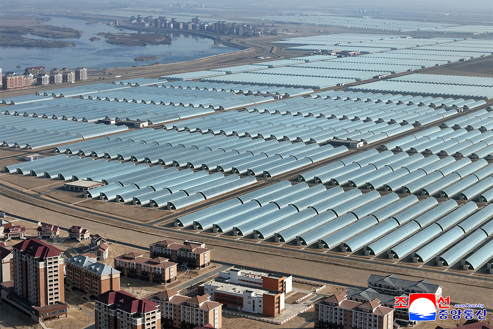 The Sinuiju Combined Greenhouse Farm, a beautiful combination of a thousand and hundreds of modern greenhouses of different types, vegetable science research center, modern houses, various bases for cultural life and peculiar landscape, is another proud monumental edifice witnessing the history of great changes in the era of Kim Jong Un and a proud gift of loyalty presented by the young builders to the Ninth Congress of the WPK.